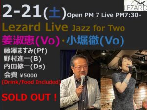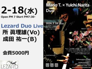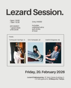 Calendar ※Sは参加自由セッションです。 日 アジェンダ 月 2月 2026 2月 2026 すべて閉じる すべて開く 2月 18 水 Lezard Duo Live 所 眞理雄(Vo) 成田 祐一(B) Open PM 7 Start PM7:30 会費5000円 チケット 2月 18 @ 19:30 2月 19 木 本多 Quintet Session PM7 – 11※S 萬造寺剛志B,秋田晃 DS,本多一光 Tp,加藤求実 Ts,N口旭 P チケット 2月 19 @ 19:00 – 23:00 萬造寺剛志B,秋田晃DS,本多一光Tp,加藤求実Ts,N口旭 P 2月 20 金 Lezard Session (八郷セッション) Open PM 7 Session PM 7:30-11 山崎 恵美 (pf) 北川 大智 (ds) 八郷 トモユキ (b) チケット 2月 20 @ 19:30 – 23:00 山崎 恵美 (pf) 北川 大智 (ds) 八郷 トモユキ (b) 2月 21 土 Lezard 昼 Session Pf 杉本亮 B 奥野雄太 Ds 浅田良太 Ds 新井康平 PM1:30 – PM5 ※S チケット 2月 21 @ 13:30 – 17:00 Lezard Vocal Duo Live Open PM 7 Live PM7:30- 小堀徹(Vo) 姜淑恵(Vo) 藤澤ますみ(Pf) 野村進一(B) 内田修一(Ds) 要事前予約 会費5000円 SOLD OUT !! チケット 2月 21 @ 19:30 2月 22 日 トシ・セッション前澤敏之P PM 2 – 5 ※S チケット 2月 22 @ 14:00 – 18:00 2月 23 月 Lezard Session 野村進一Bs 担当 PM7 – PM11 ※S チケット 2月 23 @ 19:00 – 23:00 2月 24 火 Lezard Session 槙田友紀(P) Gary Da Silva(Ds) PM 7-11 チケット 2月 24 @ 19:00 – 23:00 2月 25 水 上川井バンド LIVE & SESSION 安田信(As) PM 7 – 11 ※S チケット 2月 25 @ 19:00 – 22:30 参加自由セッションです 安田 信 AS 尾関 健 Pf 栃木一郎 Ds 壬生さん B 木村 友次郎 Vo 2月 26 木 Lezard Session野口久和 (PF)下川健一郎 (Gt) PM 7 – 11※S チケット 2月 26 @ 19:00 – 23:00 2月 2026 2月 2026